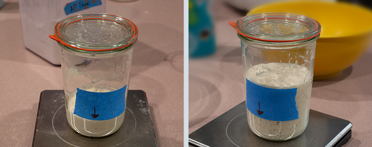Note: I like to transfer mine into a square container (pictured above) that has capacity lines on it. This makes it a bit easier to track how much the dough has risen.
