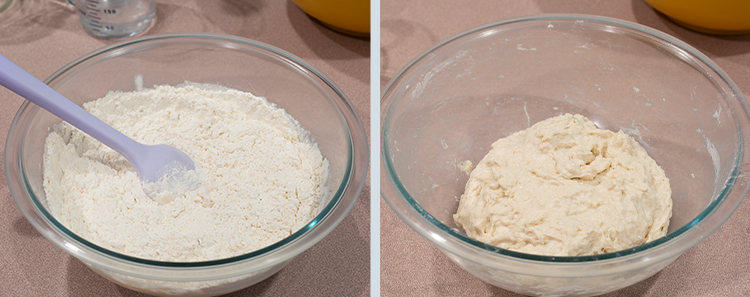 Step 2. Add the flour mixture to the bowl and mix until it just comes together. The dough will be sticky and pretty loose at this point. Cover with a kitchen cloth and let rest for 30 minutes at room temperature.