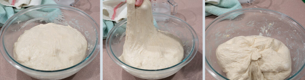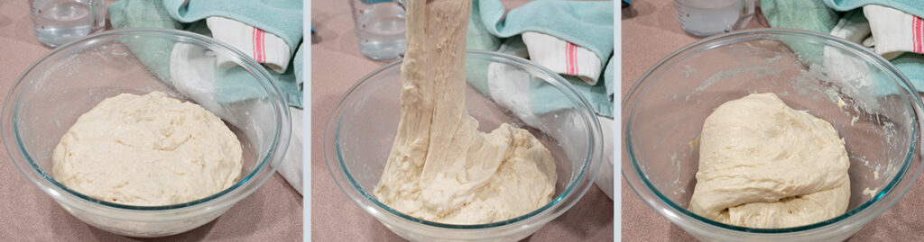 - Wet your hands, uncover the dough, and lightly pull on the dough upward as far as it will let you. Fold it to the center and gently pat down. Repeat this around the entire dough. Flip over (smooth side facing up), cover, and rest for another 30 minutes at room temperature.