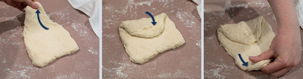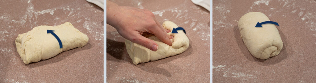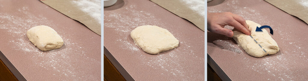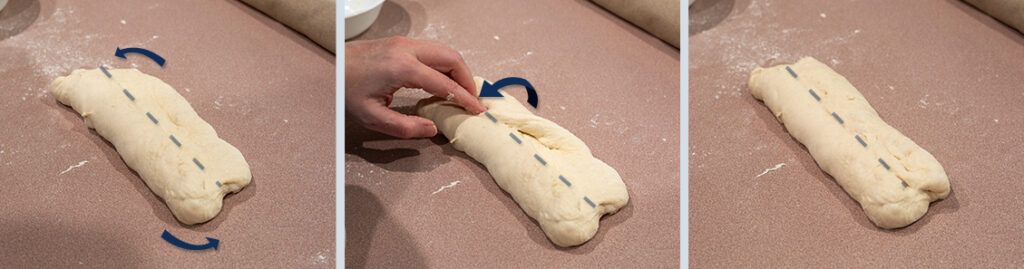 - Rotate the dough 180° so the bottom edge is now the top. Take the new top and fold it to the center, creating a single seam with the previous fold in the center of the dough.