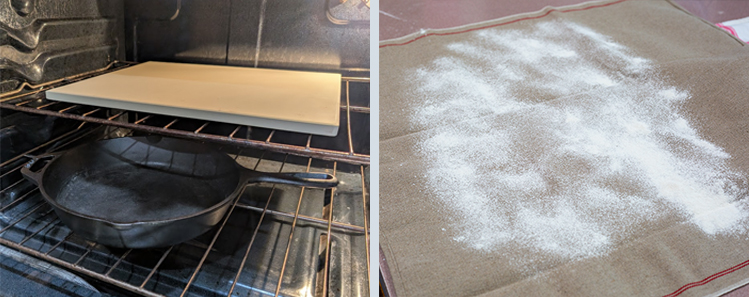 - Let the dough rest for 15 to 20 minutes. While you wait, prepare the oven by placing the baking stone on the center rack of the oven. On a lower rack place a large oven safe pan. Preheat the oven to 500°F (260°C). Prepare the baker’s couch by generously dusting with flour, set aside.