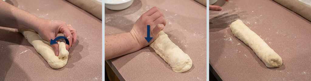- At this point you should have a rough tube shaped dough. Place the seam side down on the work area. Using both your hands, lightly roll the dough out to 16 inch (40.5 cm) long, putting slightly more pressure at the ends to taper it off.