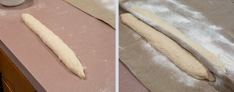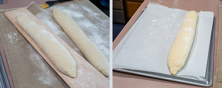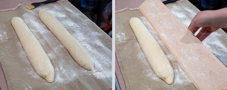 - Unwrap the baker’s couche, place the baguette transfer peel next to one of the loaves. Carefully, flip the loaf on to the peel so it is seam side down on the transfer peel.Note: If the loaf is stuck on the couche, lightly jiggle it to help it from unsticking from the couche.