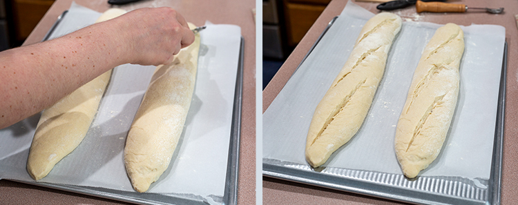 Step 26. Lightly coat a lame with flour. Using a lame to score the baguettes 3 to 5 times.