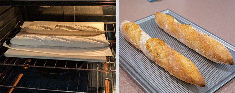 Step 28. Reduce the heat to 450°F (232°C). Open the oven door for a couple of seconds to release any remaining steam in the oven. Bake for 10 to 15 minutes, or until the crust is golden brown. Remove the loaves by using a tong to remove them from the oven and transfer to a cooling rack. Allow the loaves to cool completely before cutting them.